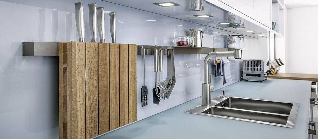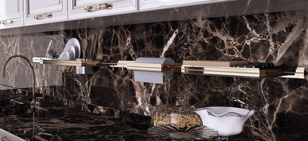 Но не стоит забывать, что среда на кухне достаточно агрессивна, поэтому не каждый материал подойдет для рейлинга у рабочей зоны. Испарения, летящие капли жира, повышенная влажность могут повредить конструкцию, снизив функциональность и испортив внешний вид системы.
