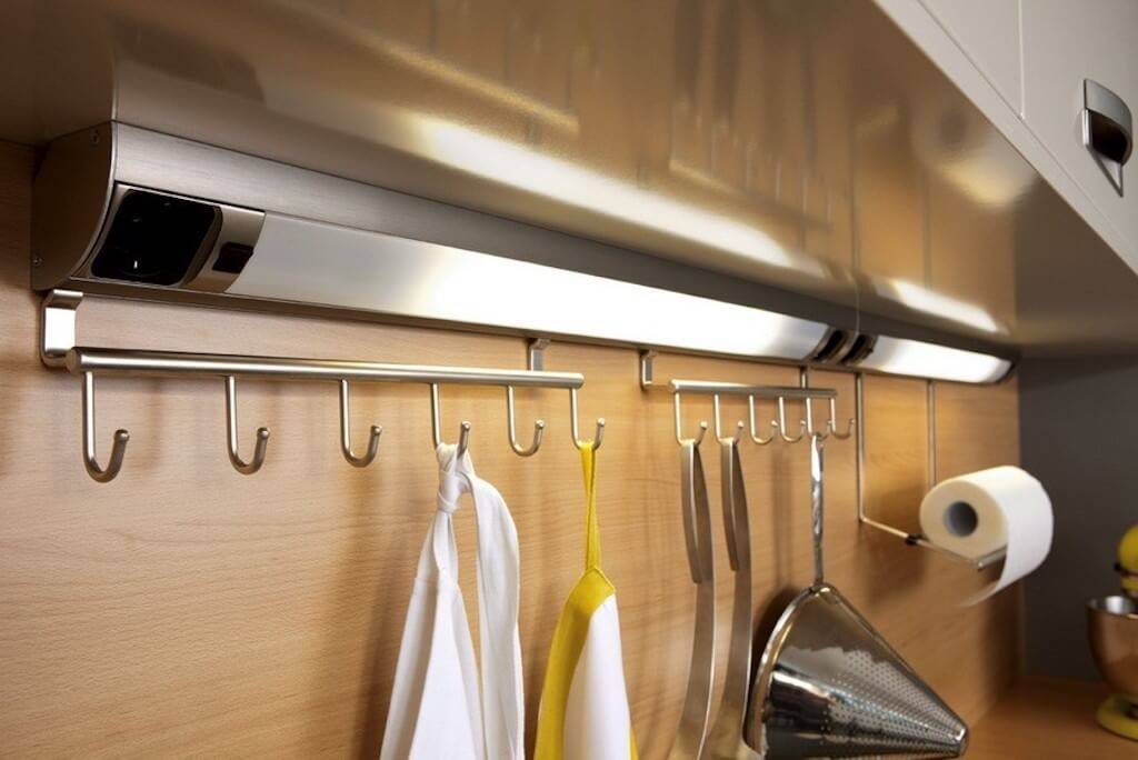 Производители подготовили массу разных рейлингов и аксессуаров для кухонь любых габаритов и конфигураций. Учитывая особенности помещения, можно выбрать максимально подходящий рейлинг.