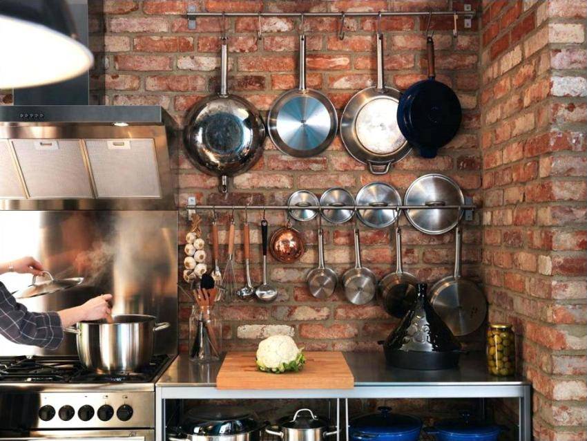 При подвешивании на стену все сковородки подлежат всеобщему обозрению. Чтобы не портить интерьер современной кухни, старые изношенные предметы выбрасывают или прячут в шкаф. На виду оставляют только новую кухонную утварь.