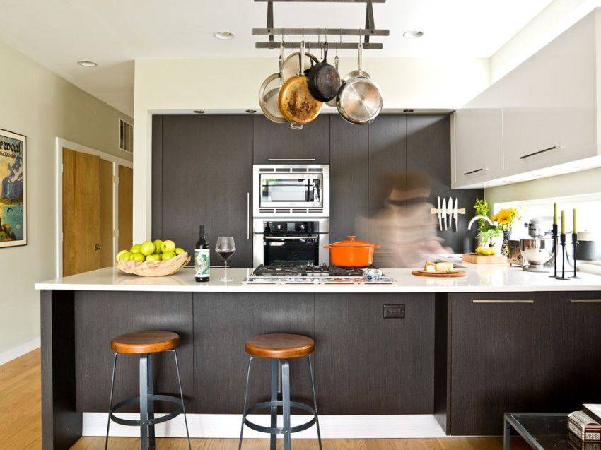 Чаще всего 1–3 небольших рейлингов будет вполне достаточно. Даже на достаточно просторной кухне площадью 12 кв. м лучше не использовать более трех 60-сантиметровых штанги, чтобы визуально не захламлять и не перегружать пространство.