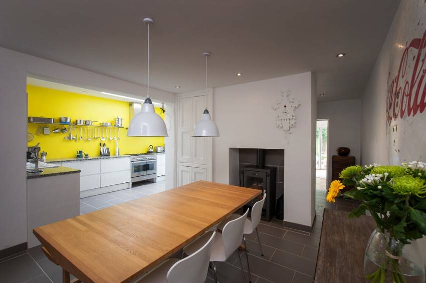 Кухонный фартук оформлен ярким желтым закаленным стеклом и рейлинговой системой для хранения