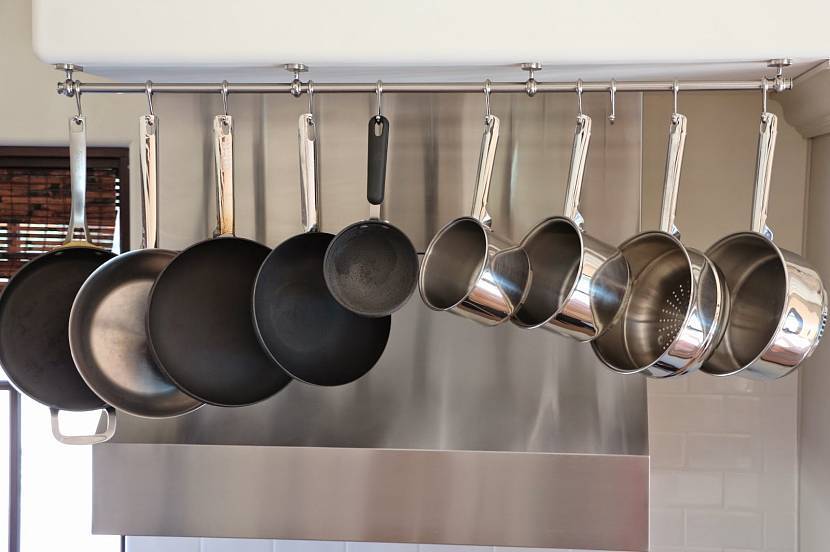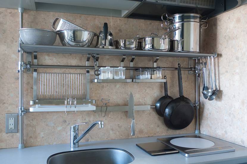 Подвесные. Эту конструкцию крепят к потолку и на крючках располагают кухонные аксессуары и посуду. Сковородки и кастрюли при таком размещении всегда будут под рукой.