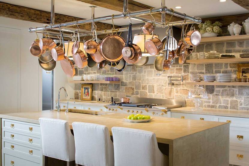 Потолочный рейлинг с посудой отлично впишется в кухню в стиле кантри