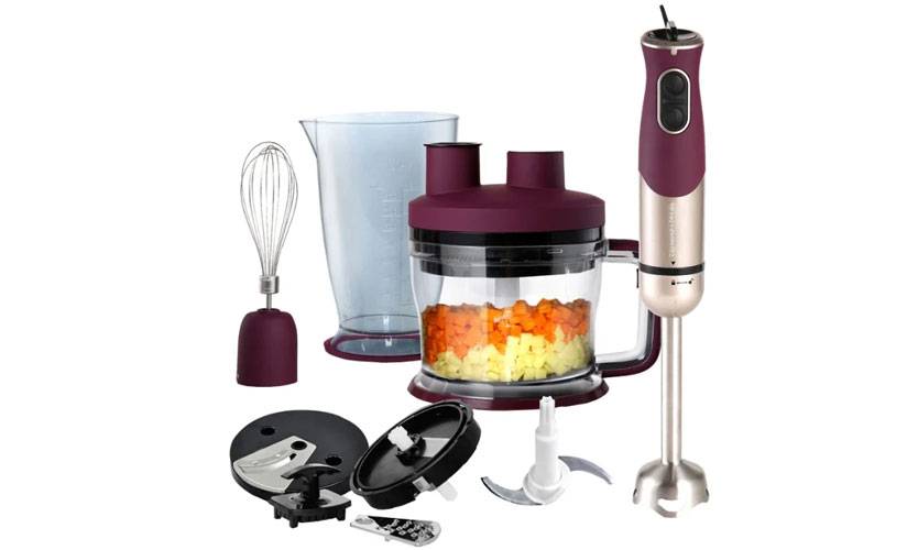 В набор входит терка, диск для изготовления ломтиков, насадка для кубиков, измельчитель на 1750 мл с отверстием для добавления продукта, измерительный стакан на 0.6 л, венчик для взбивания. Погружная ручка металлическая.