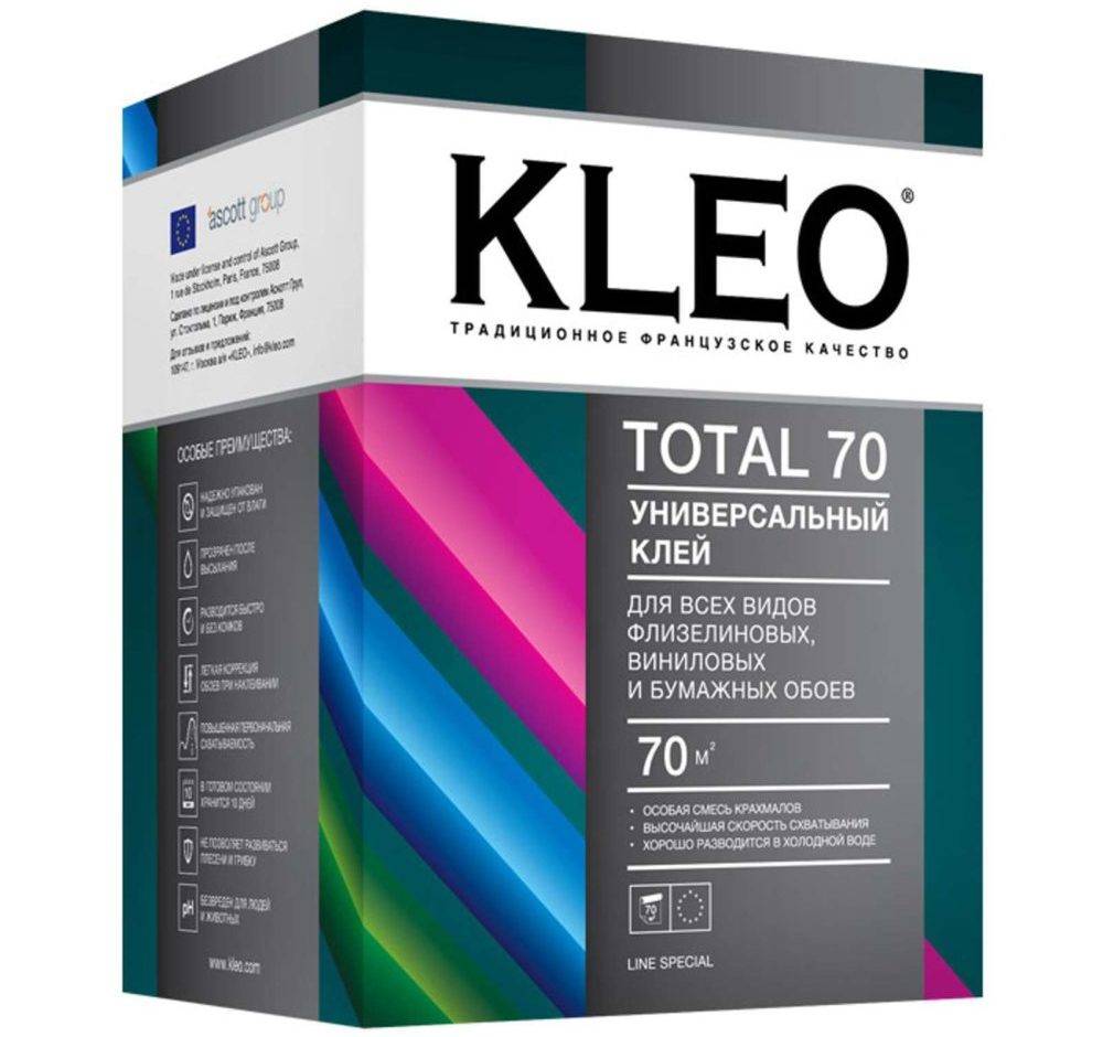 KLEO TOTAL Универсальный – клеевой состав, который подойдет для наклеивания любых типов обоев. Он представляет собой смесь из крахмала, метилцеллюлозы и некоторых других синтетических добавок.