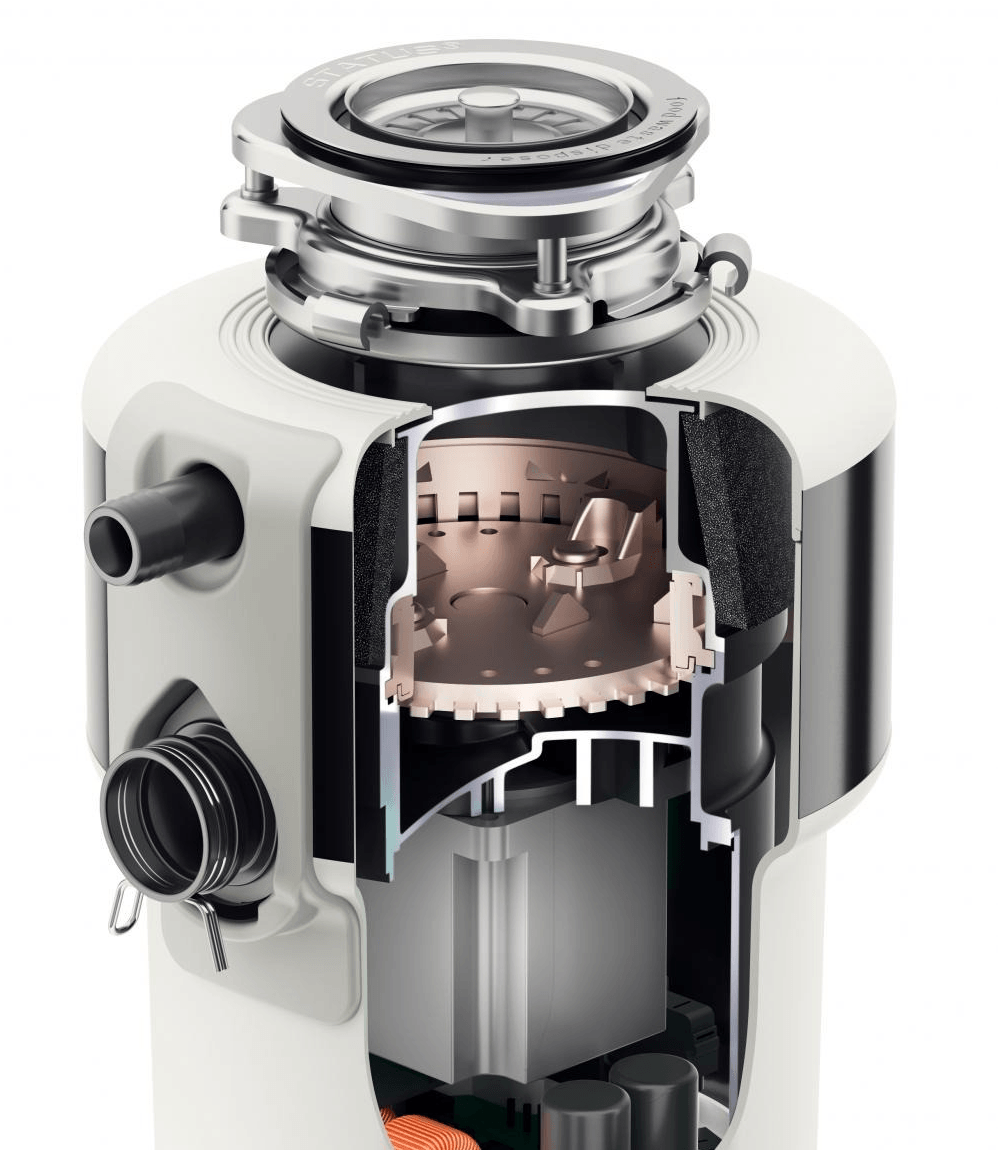 Полупрофессиональный диспоузер оснащен магнитно-индукционным двигателем и качественным измельчающим механизмом с лазерной балансировкой, что позволяет устройству справляться не только с фруктами, овощами, крупами, но и со скорлупой орехов или косточками.