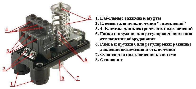 Накидная гайка под номером 7 подключается к пятерику. Через ее вход на пружинный блок воздействует давление воды. Как только оно падает ниже выставленного значения, происходит воздействие на клеммы, которые обозначены цифрой 2. Контакты замыкаются и на насос подается питание. После перекрытия смесителя или крана давление в системе начинает возрастать. Когда оно достигает верхней точки, тогда давление на пружину увеличивается, и она размыкает контакты.