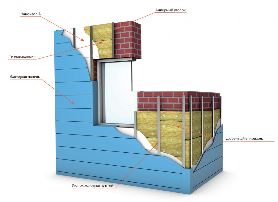 После проведения этих работ можно устанавливать внешнюю облицовку фасада. Она устанавливается на встроенный в стену каркас на расстоянии 4-5 сантиметров от изоляции внутреннего слоя.