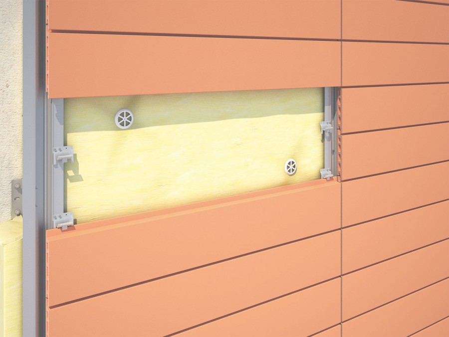 - Видимое крепление. Монтаж выполняется с помощью металлических заклепок и винтов. Для изготовления крепежных элементов используются материалы, устойчивые к коррозии: алюминий, оцинкованная сталь. Конструкция подсистемы состоит из скоб и вертикальных профилей разной формы. Чтобы свести к минимуму риск теплового расширения прикрепленных деталей, их монтаж выполняется на плавающие и фиксированные точки. Видимая часть заклепок окрашивается в цвет плит атмосферостойкой краской.