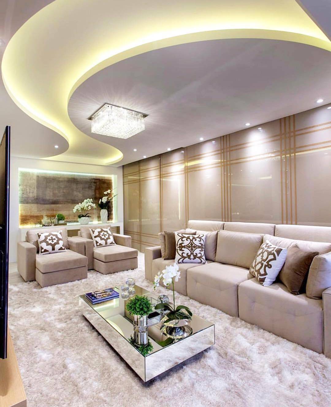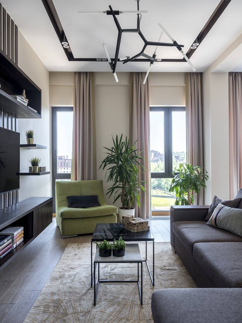 Современный потолок дает много возможностей в дизайне интерьера. Данная плоскость гостиной может быть эффективно выделена. Благодаря современным материалам и технологиям легко сделать декоративные подрезы, углубления, отверстия, узоры или разные уровни. Стильный дизайн интерьера создаст неповторимую атмосферу.