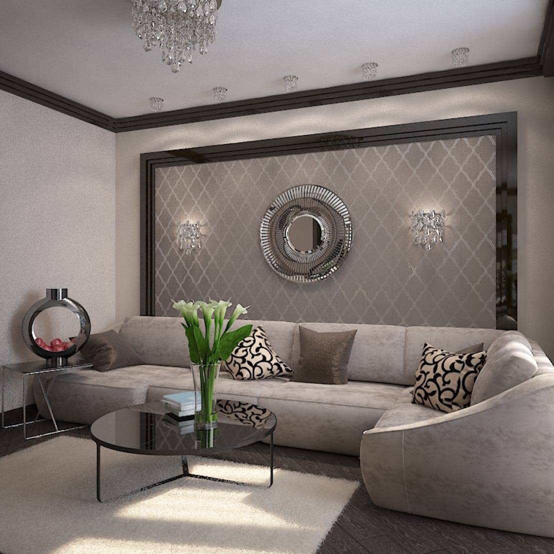 Для компактных гостиных подойдут светлые краски, благодаря которым площадь комнаты будет казаться больше. Удачно дополнит интерьер, гармонирующий с общим цветом, узор на одной из стен.