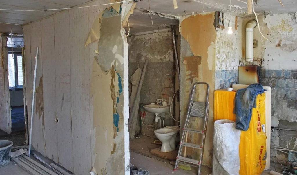 - Демонтируют все, что уже отслужило – убирают проводку (если это нужно), окна с поврежденными рамами, снимают обои, срезают отопительные батареи, стояки с поржавевшими трубами и старое покрытие пола. Когда задумана перепланировка, убирают ненужные перегородки.