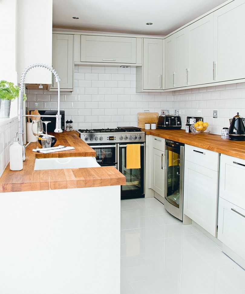 Одно из самых популярных решений на кухне – использование керамической плитки. Она используется для отделки пространства над мойкой и плитой. Цвет плитки подбирается в тон стенам, либо он должен контрастировать со столешницей. Плитку можно заменить пластиком или стеновой панелью ДСП.