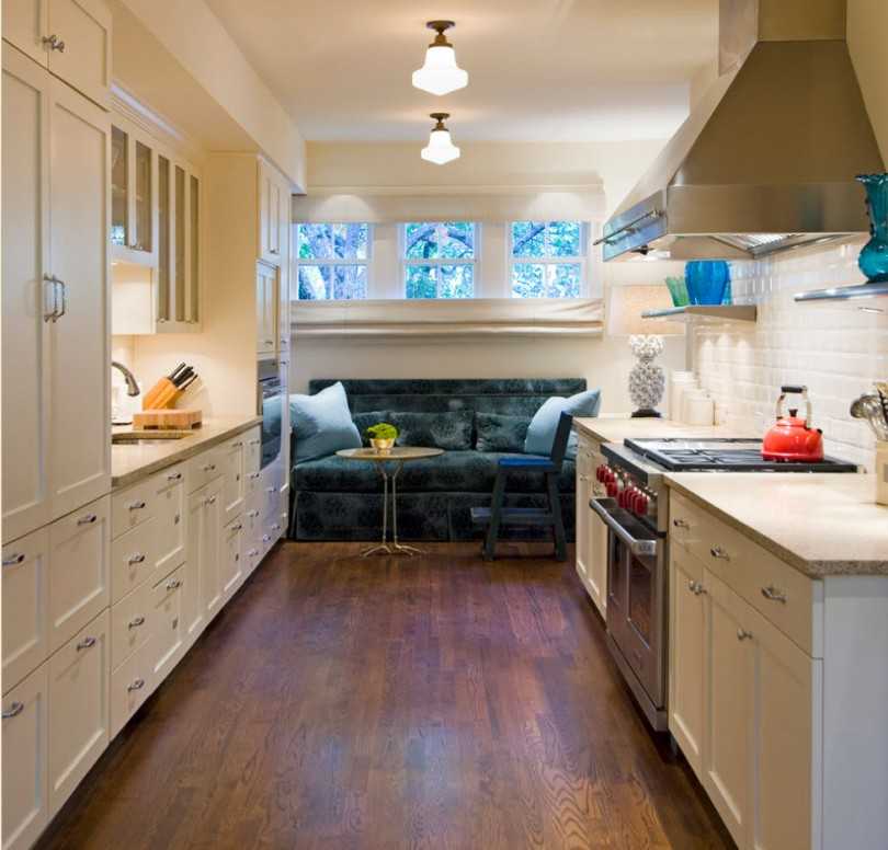 Более рациональное решение – керамогранит на кухне. Тверже плитки, не боится влажности, но более дорогой вариант. Любителям «экологичных» материалов можно посоветовать – деревянные полы, основной недостаток – чувствительны к перепадам температур и дорогостоящие. Еще одним вариантом является пол из пробкового материала, легко моется, безопасен, оказывает оздоровительное влияние на человека. К одним из дешевых и универсальных материалов относится линолеум. Сегодня можно выбрать линолеум с антибактериальными свойствами, из натуральных материалов, безопасных для здоровья, без запаха – идеальное решение для кухни.