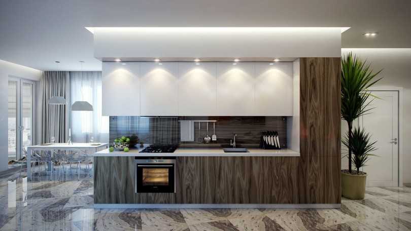 Производится монтаж кухонного фартука, отделка стен, потолка, пола выбранными материалами. Отделку обычно начинают с потолка, затем оформляются стены, последним укладывают пол.