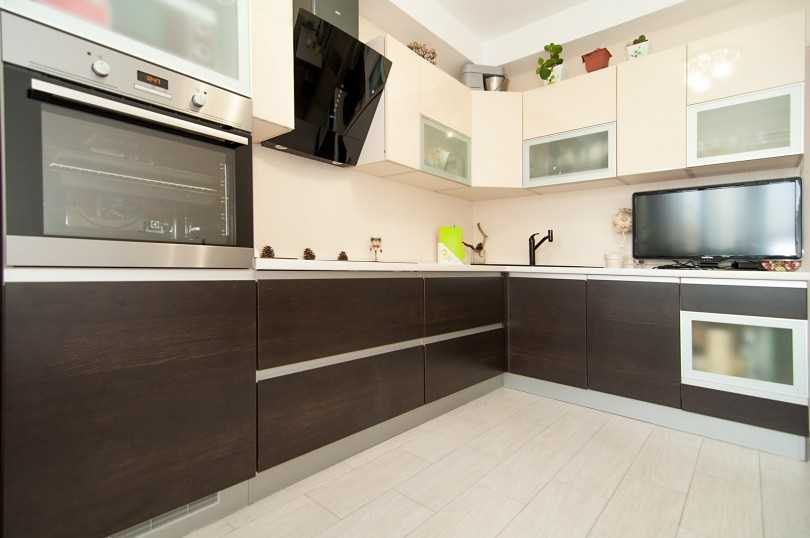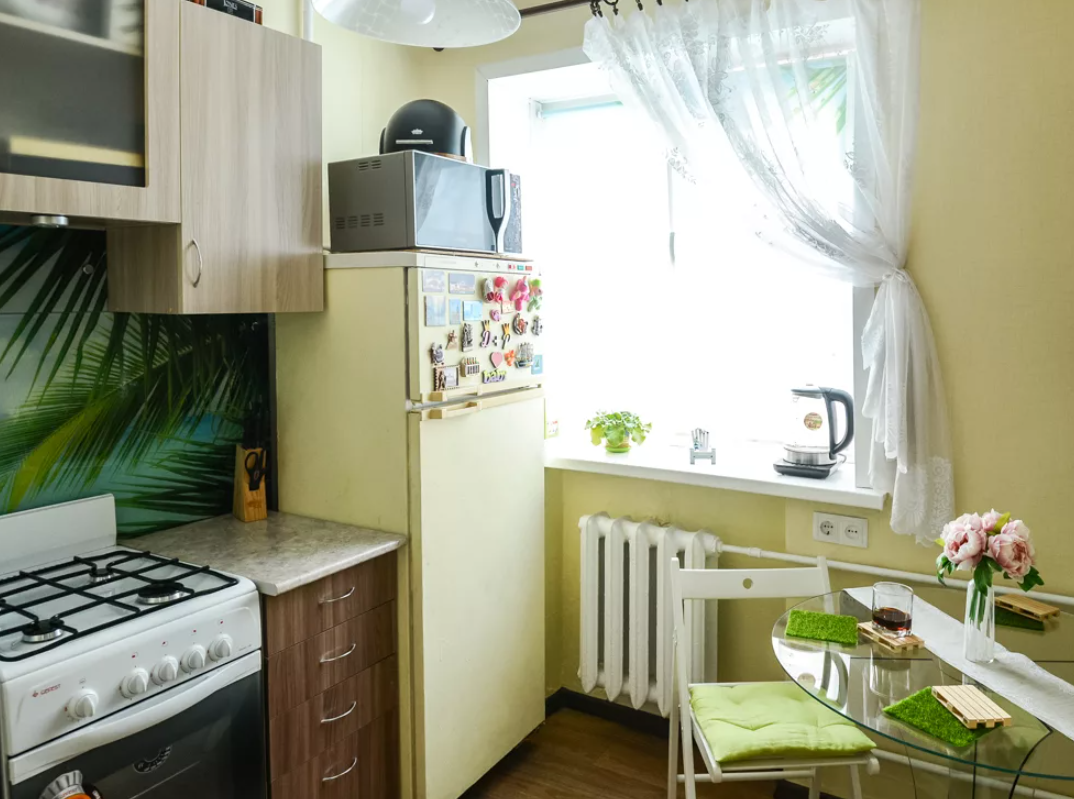 Ремонт кухни в хрущевке должен быть практичным, потому рекомендуют использовать строительные материалы, которые не испортятся при взаимодействии с агрессивной щелочью и горячим воздухом.