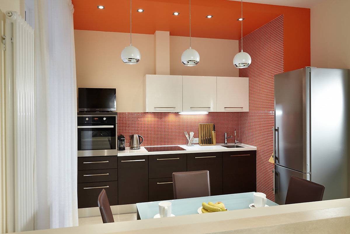Для потолка в таких квартирах используют только покраску или побелку из-за изначально низких потолков (менее 2,7 м). Подвесные или натяжные конструкции «украдут» еще несколько сантиметров. Цвет выбирают светлый для визуального увеличения пространства.