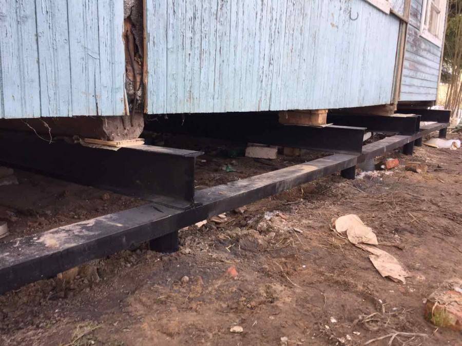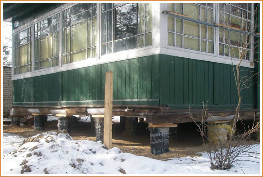 - Дом медленно опускается с домкратов на новый столбчатый фундамент.