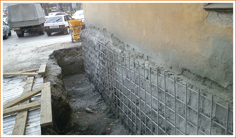 Сначала делается подкоп под основание старого фундамента. Это необходимо для увеличения сцепления нового бетонного слоя со старым.
