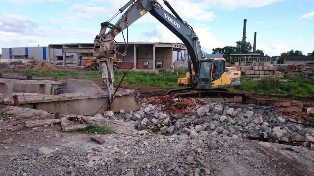 - Демонтаж гидромолотом – этот инструмент представляет собой насадку на стрелу экскаватора. Он работает по аналогичному принципу, что и отбойный молот. Его применяют для измельчения кирпича и бетона. После данной процедуры, осколки бетона грузятся в кузов самосвала, и выводится с территории;