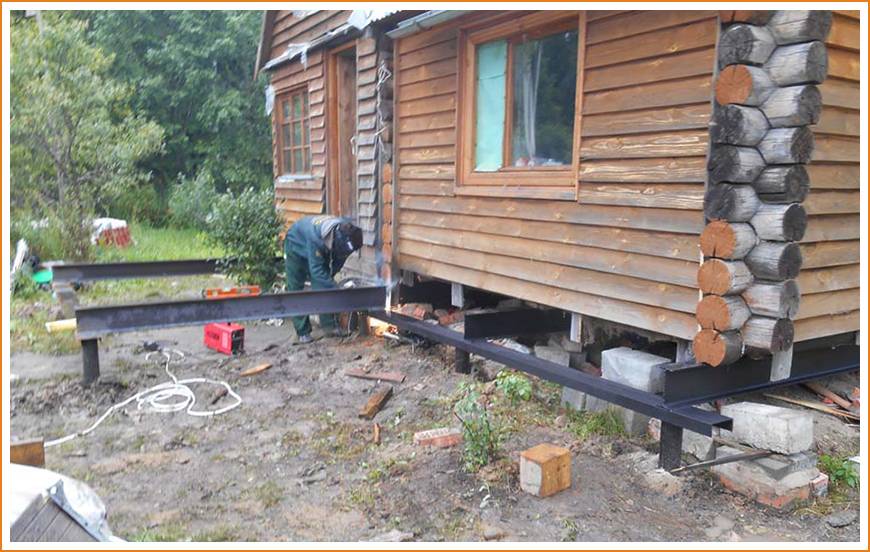 В первую очередь следует удалить камни или отрезок бетона из-под одного из углов. Для этого выбирается определенный слой земли, удаляются остатки старого фундамента. На этой стадии можно приподнять просевший угол бревенчатой коробки при помощи домкрата.