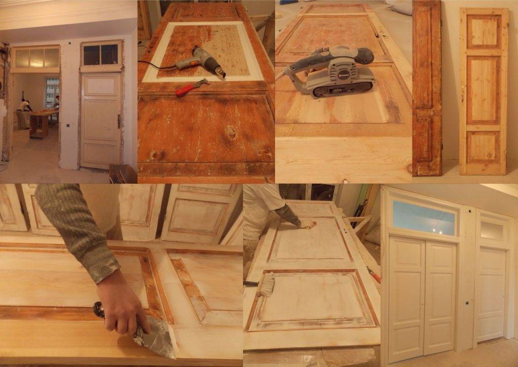 Этот процесс не будет чем-то сложным, если действовать поэтапно, вооружиться нужными инструментами и материалами. Перед тем, как отреставрировать деревянные межкомнатные двери, надо снять полотно, открутить замки и фурнитуру, положить горизонтально, чтобы было удобно работать. И можно приступать к отделке. Весь процесс состоит из нескольких этапов.