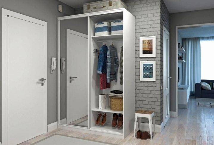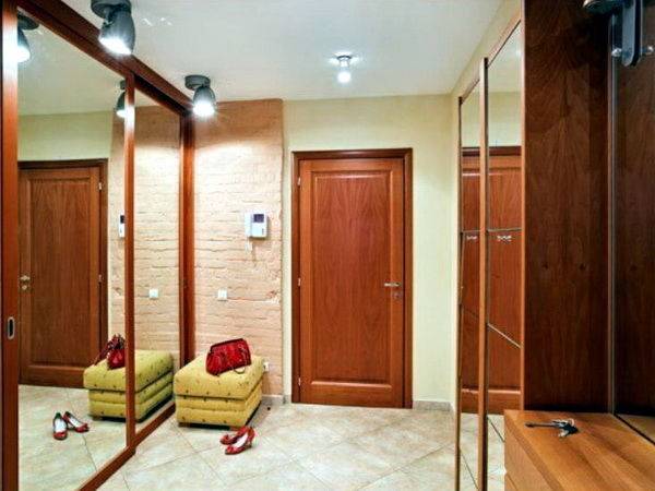 Использовать шкафы-купе. Несмотря на то, что этот предмет интерьера уже вышел из моды, его практичность никто не отменял. К тому же, если сделать створки стеклянными, то можно решить одновременно 2 задачи – всегда оценивать свой внешний вид перед выходом и визуально расширять пространство;