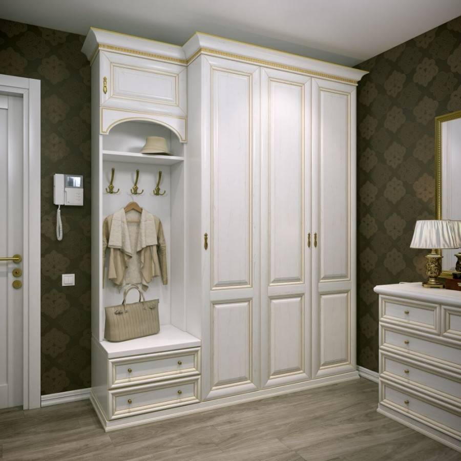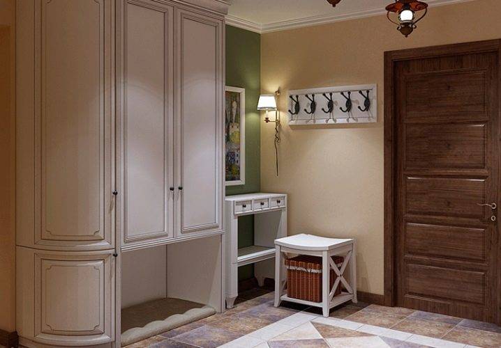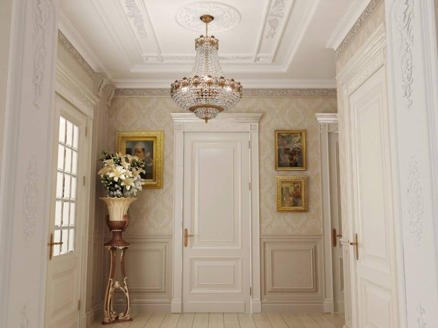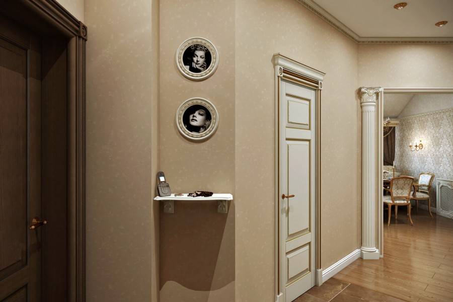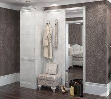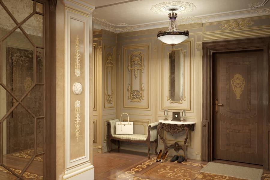 При желании оформить прихожую в классическом стиле стоит придерживаться светлых оттенков и бежевой палитры. Для отделки стен подойдут обои под покраску и штукатурка. Допускается использование тканевых и деревянных вставок. Полы покрываются ламинатом или плиткой, имитирующей мрамор.