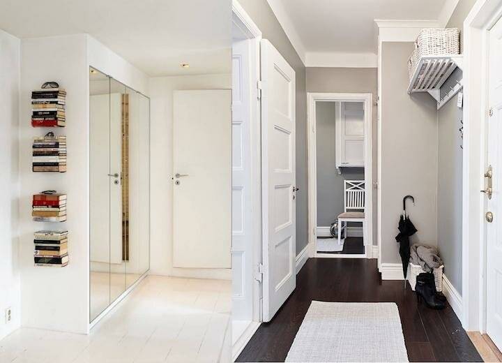 Если планировка прихожей позволяет разместить зеркальный шкаф-купе прямо напротив входной двери, обязательно используйте такую возможность.
