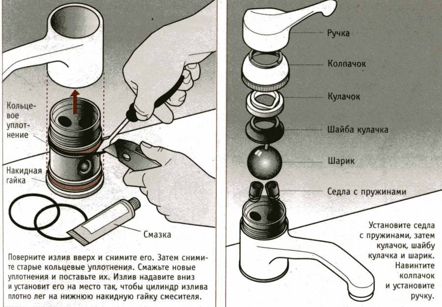 В обоих сантехнических приборах присутствуют уплотнительные манжеты, которые отвечают за герметизацию стыков. Чаще всего именно они и выходят из строя. Чтобы до них добраться, надо разобрать смеситель полностью. Необходимо обозначить, что и шар, и картридж – детали невечные. Нередко и они становятся причинами подтёков.