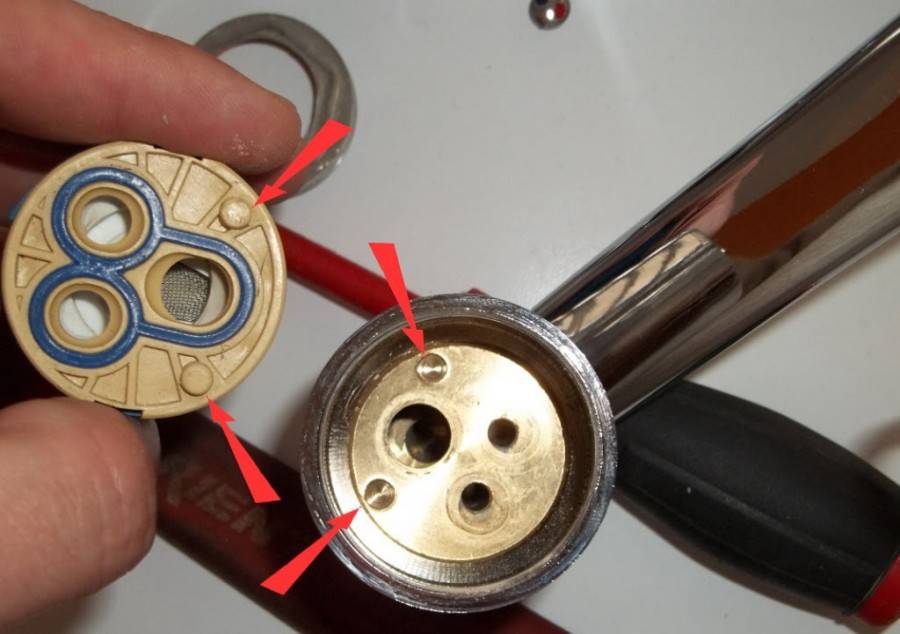 Новый картридж устанавливаем таким образом, чтобы его отверстия совместились с отверстиями внутри корпуса смесителя. Затем прикручиваем обратно шайбу (сначала руками, потом плотно, но не слишком туго ключом).