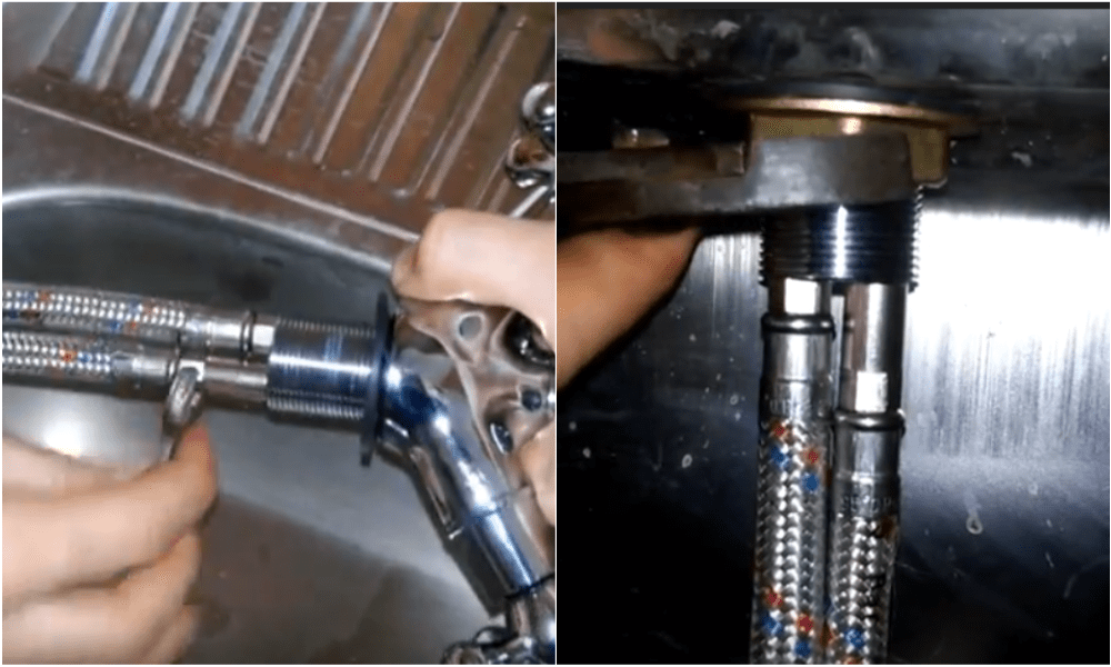 - Далее следует провести гибкие шланги через отверстие для монтажа. Для этого мойку снова нужно держать в перевернутом положении и придерживать смеситель. Следует убедиться в том, чтобы кольцевая прокладка во время данной операции оставалась на месте и не смещалась.