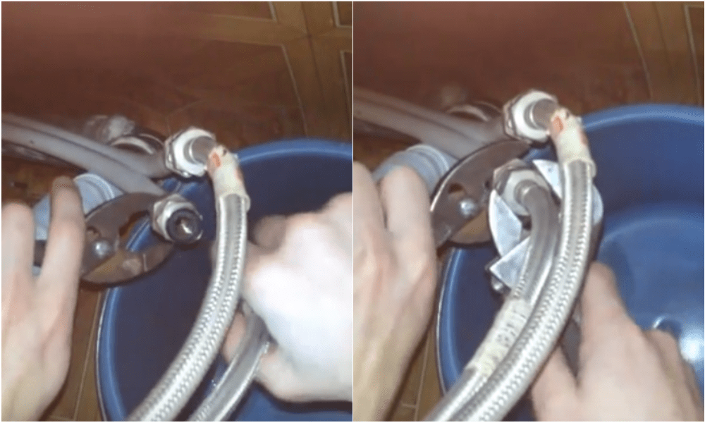 - Воспользовавшись разводным ключом нужно снять гибкие шланги с трубы. Чтобы перелить воду, еще находящуюся в трубе следует воспользоваться емкостью. Постарайтесь работать аккуратнее, чтобы соединения не повредились.