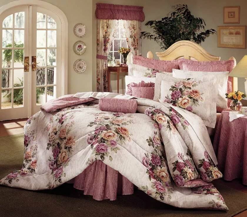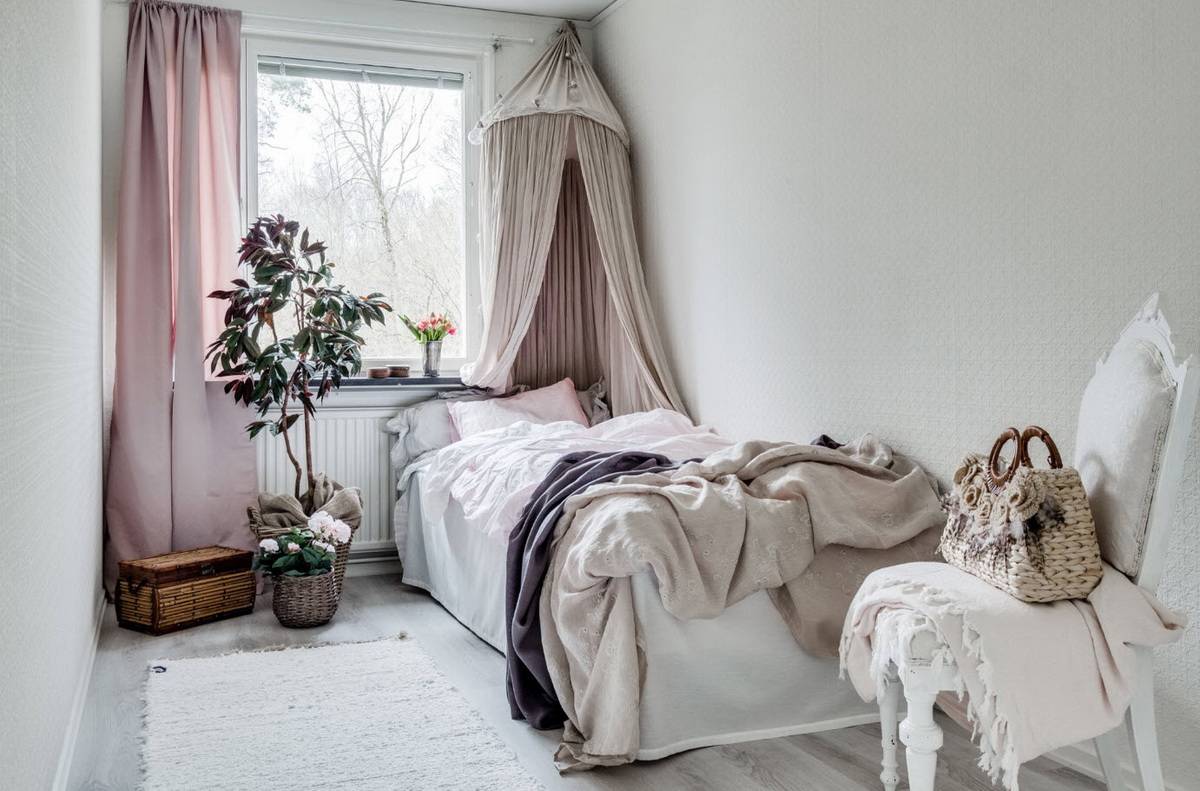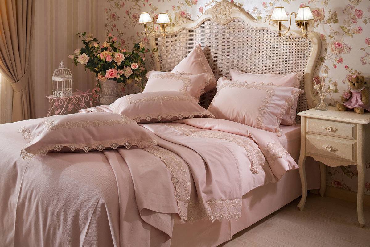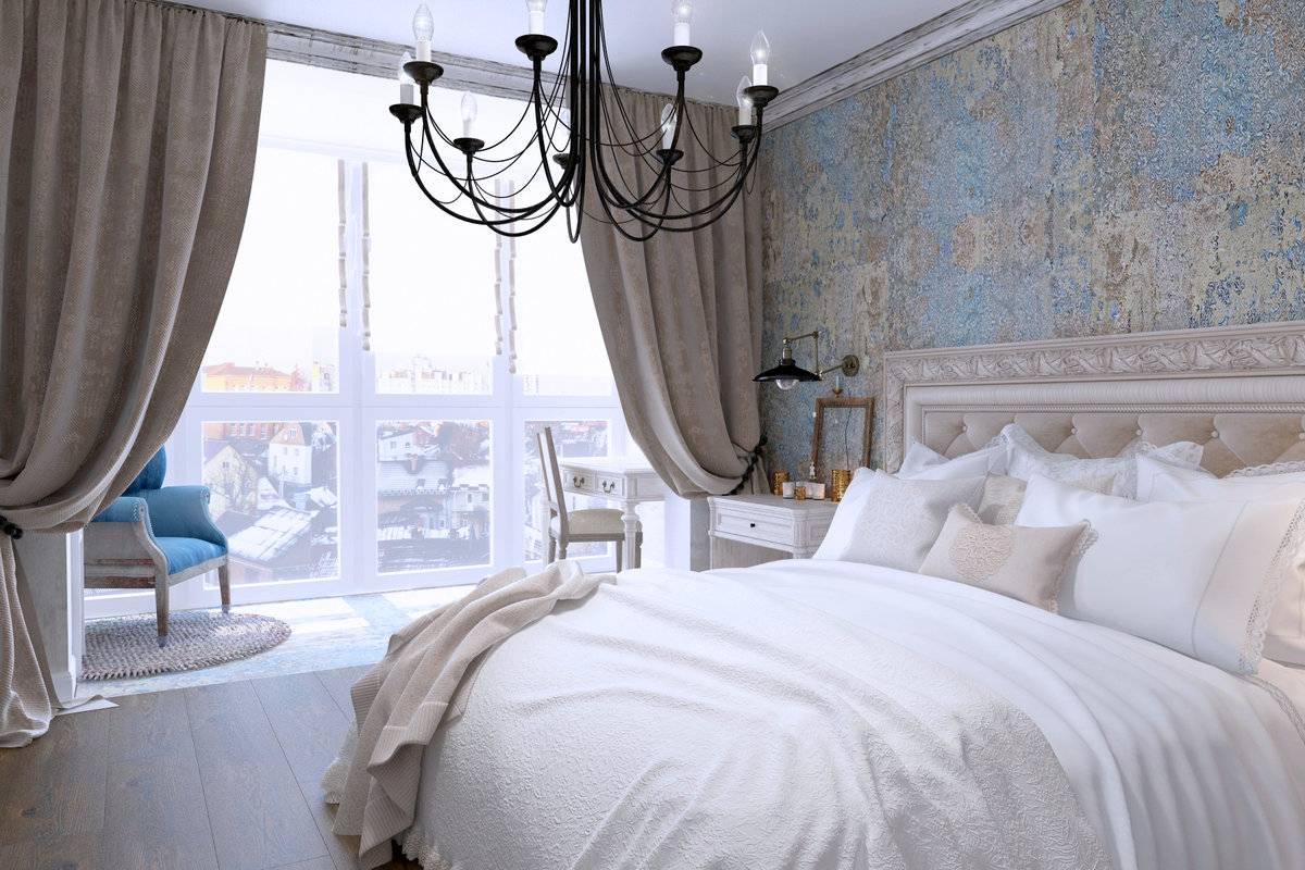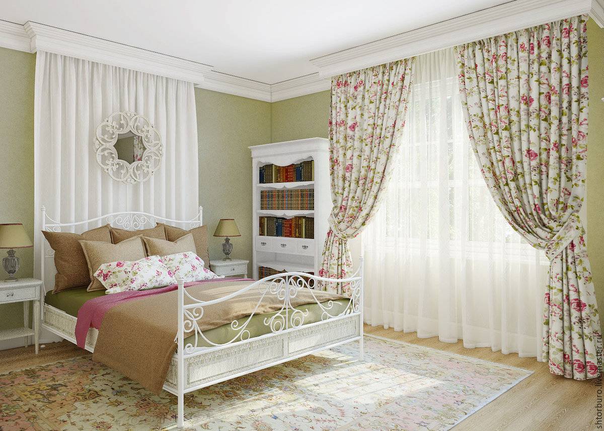 Изящный, романтичный и нежный стиль. Все элементы выполняются с пастельных тонах. Мебель довольно строгая, простой формы. Украшают помещение с помощью большого количества текстиля, это может быть плед с цветочным принтом, шторы в подобной расцветке. Живые и искусственные цветы помогут сделать спальню еще более уютной.