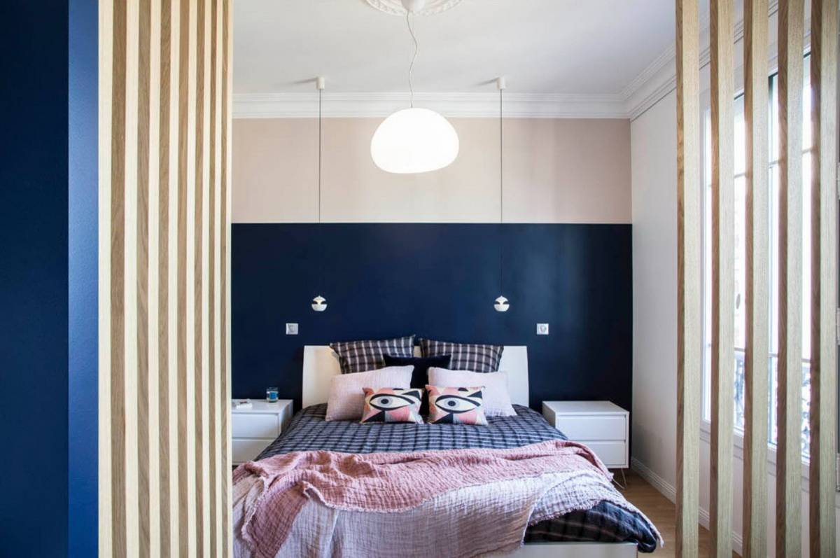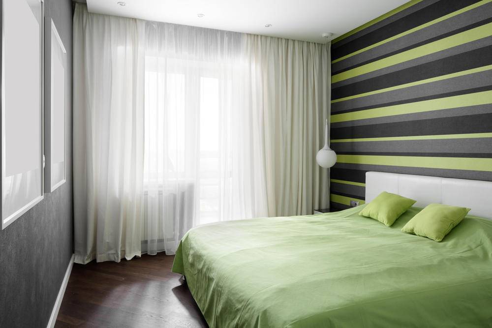 Дизайн спальни, сочетание двух видов обоев