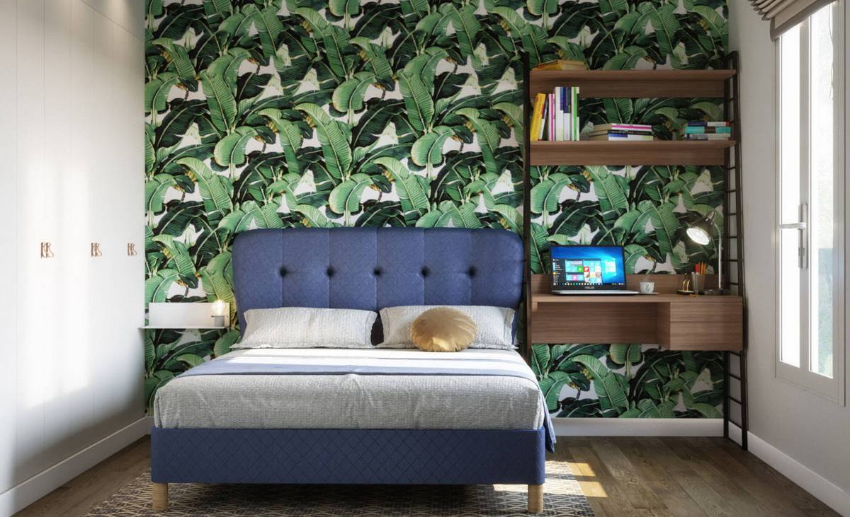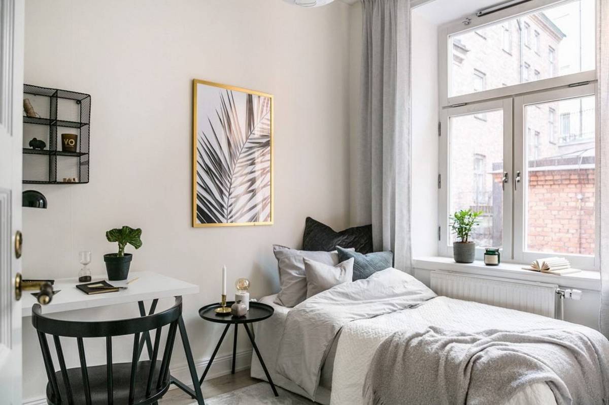 Для письменного стола и кресла выбирают часть комнаты, которую можно отделить от спальной зоны небольшой декоративной перегородкой. Или же крепят лампы таким образом, чтобы освещение для стола не попадало на место отдыха. При высоких потолках есть возможность создать антресоль, где удобно расположится спальное место, а внизу под ним можно поставить рабочий стол или полки гардероба.