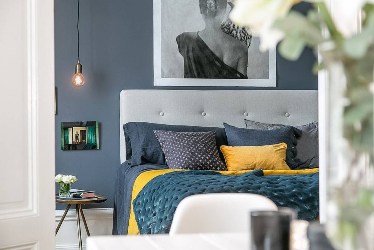 Дизайн яркой спальни в голубых тонах