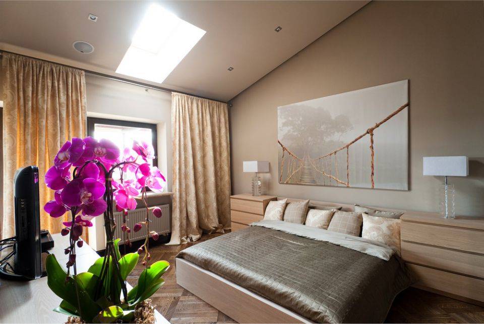 Спальня предназначена для отдыха и расслабления, поэтому ярким кричащим цветам, блеску, обилию декора в ней не место. Для оформления рекомендуется выбирать приглушенные светлые цвета, которые будут воздействовать успокаивающе.