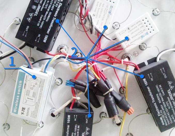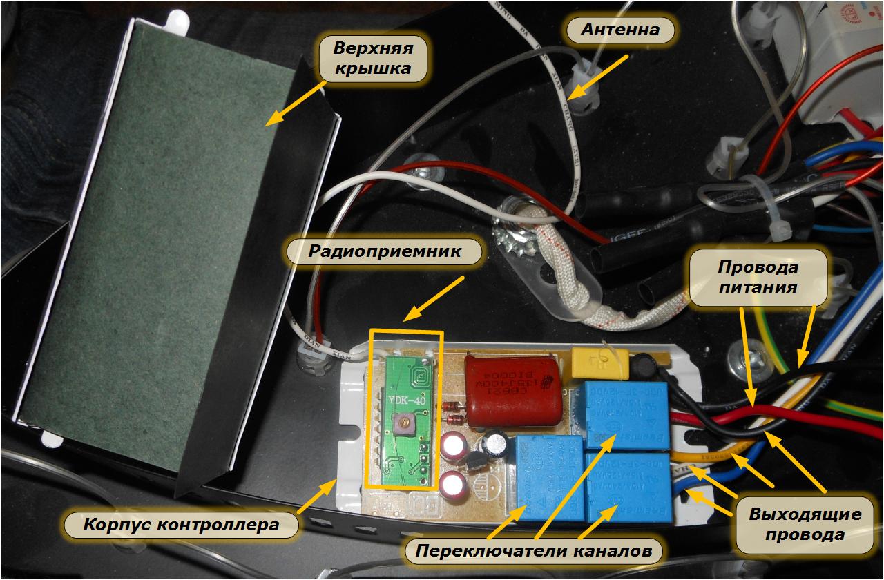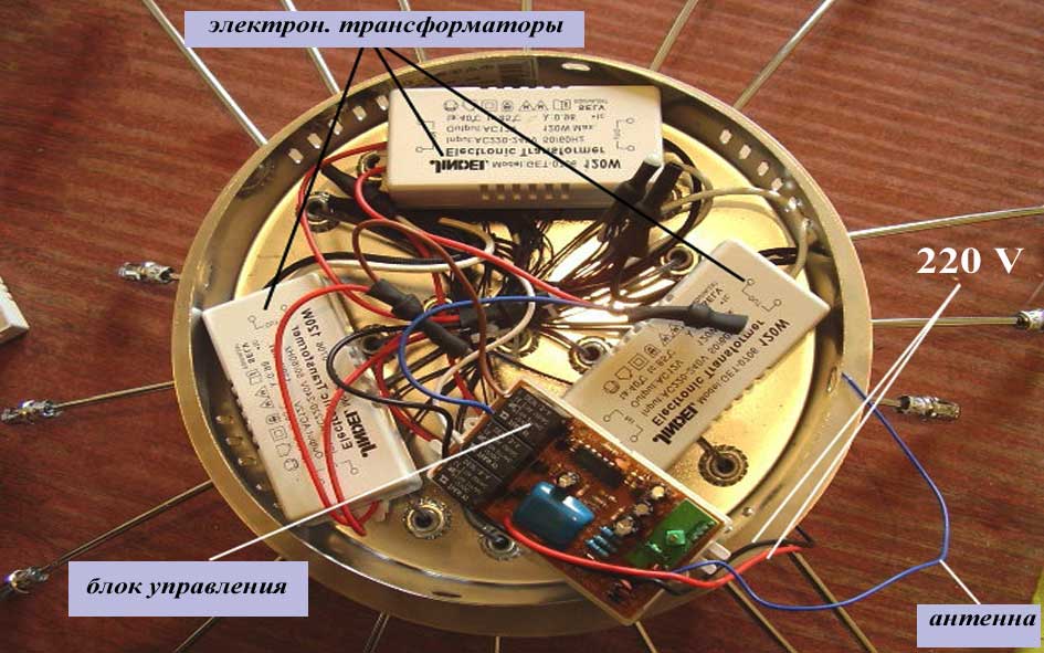 Все люстры оборудуются реле радиоуправления, в котором устанавливается модуль, принимающий радиосигнал, поступающий с пульта. Каждая модель отличается определенным количеством электромагнитных реле, выполняющих коммутацию токов разной мощности.