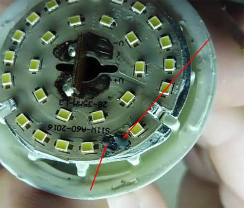 ![]() | Сняв крышку рассеивателя внимательно осматриваем светодиоды. Если замечена подобная черная точка – элемент перегорел. |