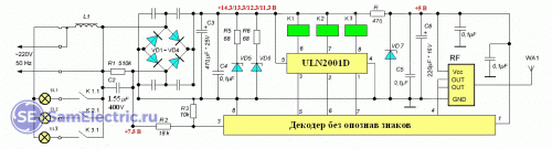 Приемником радиосигнала (RF) служит модуль YDK-30. Он преобразует ЭДС, наведенную в антенне, в последовательность импульсов с амплитудой, достаточной для работы дешифратора. Построен декодер на микросхеме HS153. Получив команду, дешифратор включает или выключает соответствующий транзисторный ключ. Этот ключ, в свою очередь, управляет электромагнитным реле, которое подает напряжение на соответствующий светильник. Светильники построены на LED или на галогенной лампе с соответствующим драйвером или электронной пускорегулирующей арматурой.