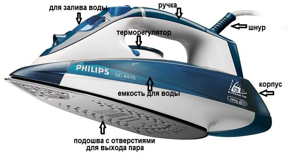 Если говорить в общих чертах, каждый утюг состоит из корпуса, ручки, терморегулятора и подошвы с отверстиями, через которые в зону глажки подается пар. Для поддержания режима отпаривания в корпус утюга встроена емкость для воды, также имеются регуляторы интенсивности режима отпаривания.