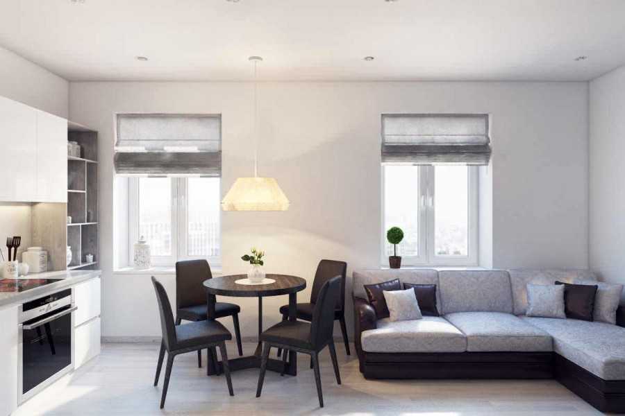 Минимализм всегда актуален для малогабаритного помещения. Для него характерна мебель с гладкими фасадами без ручек, минимум декора, отсутствие штор на окнах.