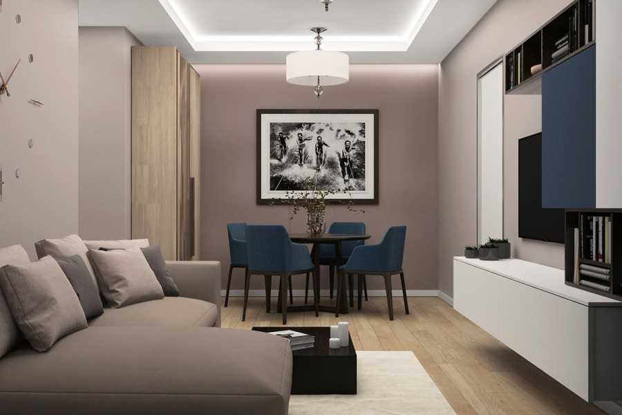 Интерьер гостиной в хрущёвке начинается с отделки пола и потолка. Двухкомнатный вариант квартиры подразумевает, что во всех частях стиль помещения будет сочетаться и гармонировать. Ламинат или плитка должны быть одинакового цвета независимо от того, где они выкладываются.