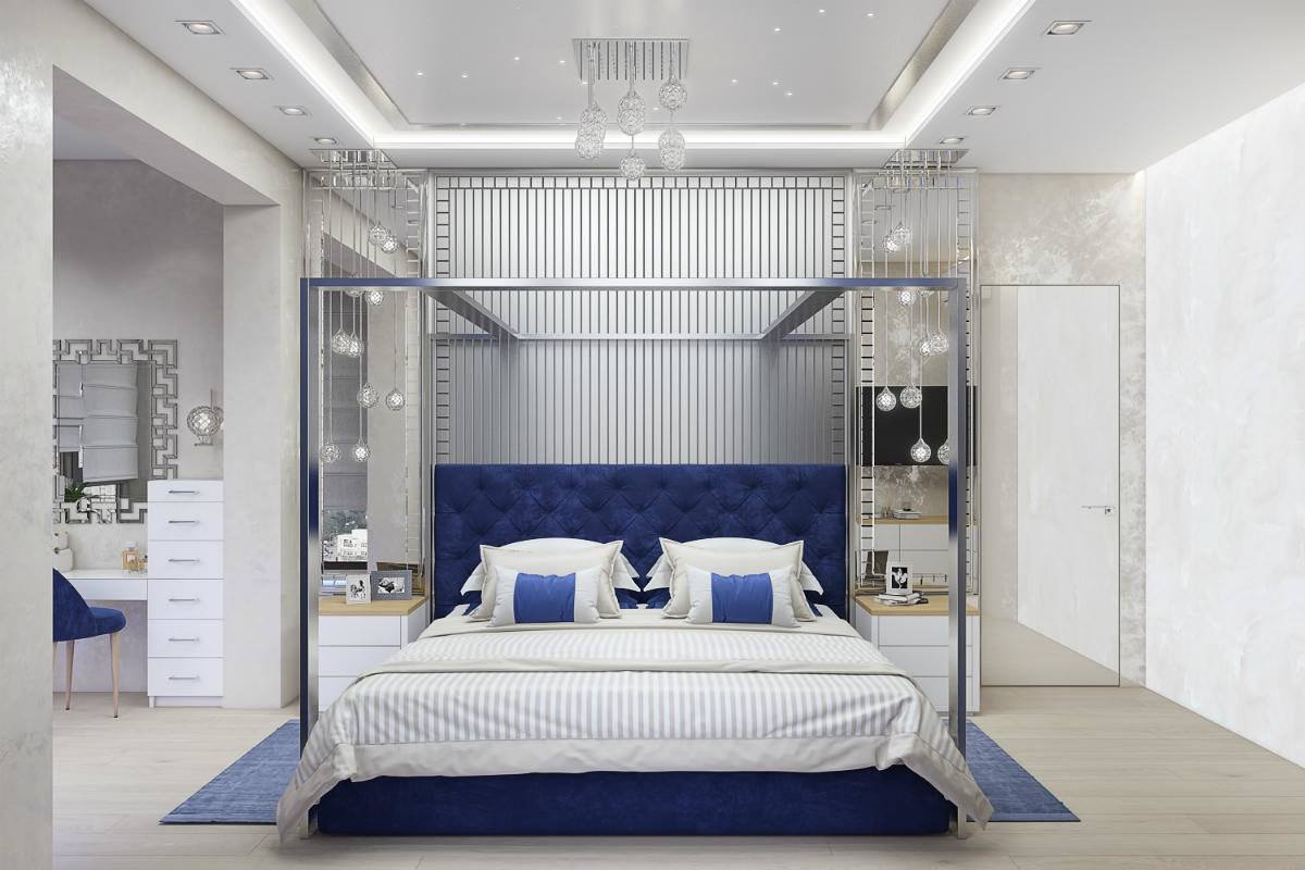 Если поверхность потолка имеет неровности, а высота комнаты больше 3 метров, то идеальным оформлением станет использование натяжного потолка. Он скроет все дефекты. К тому же, натяжной потолок спасет спальню от возможных протечек воды с верхних этажей;