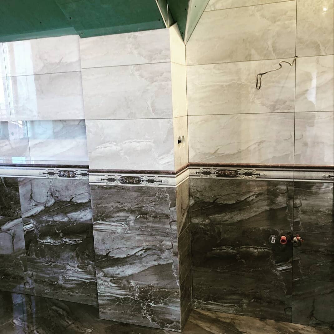 Далее при необходимости выполняется стяжка под плитку на полу, и подготавливаются стены. Покрытие стен необходимо выровнять штукатуркой и при помощи отвеса нанести разметку на стены. Благодаря этим линиям плитка должна лечь ровно. Укладку необходимо начинать снизу, используя специальный клей.