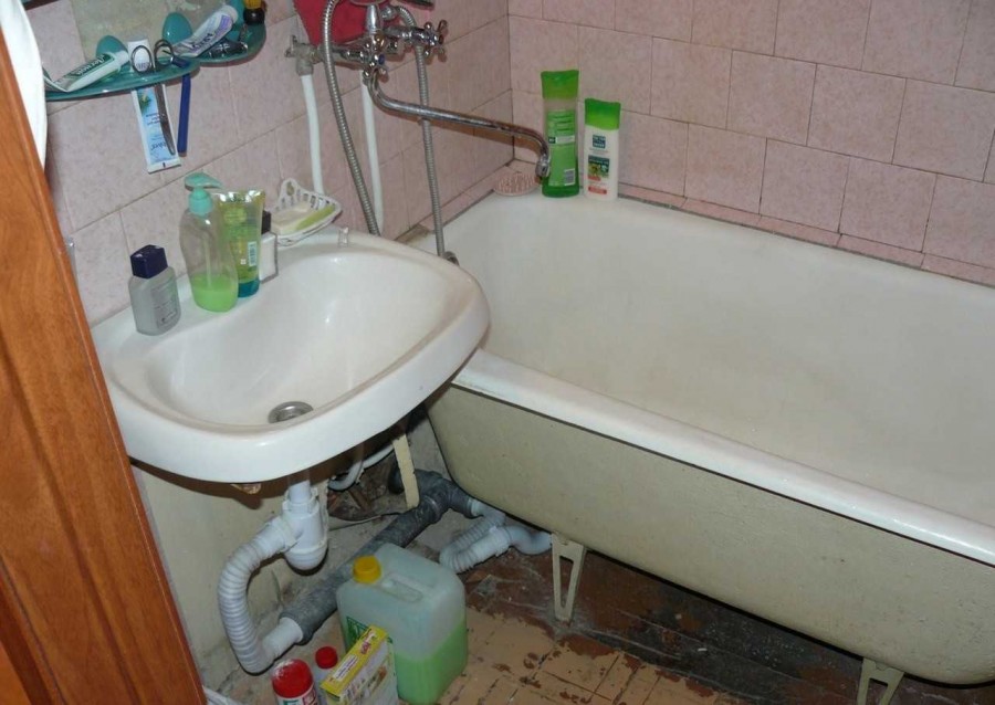 После перекрытия подачи воды из комнаты выносят старую ванну, снимают сантехнику и аксессуары, разбирают сантехнический шкаф. Демонтируют водопроводные и канализационные трубы, вход в стояк канализации закрывают заглушкой. Без этого комплексный ремонт невозможно будет провести.