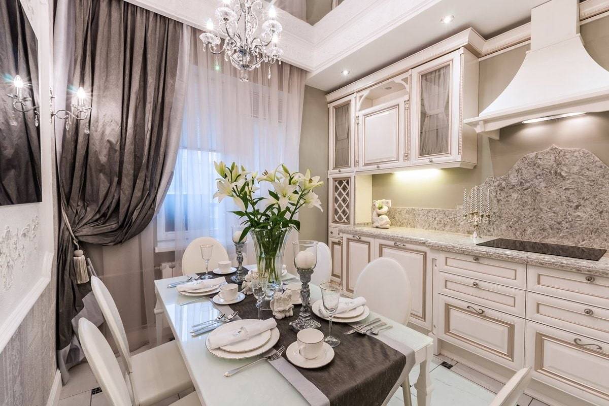 Электрическая подсветка каждой зоны в кухне-гостиной на 18 квадратов не только позволит визуально разделить пространство, но и уменьшит расходы на электроэнергию. Точечное освещение необходимо сделать по периметру гарнитура, в прозрачных полках и вдоль фартука. Что касается дизайна кухни-гостиной, здесь очень красиво будут смотреться абажуры, настенные бра и люстра. Над большим обеденным столом уместно повесить галогенные лампы.