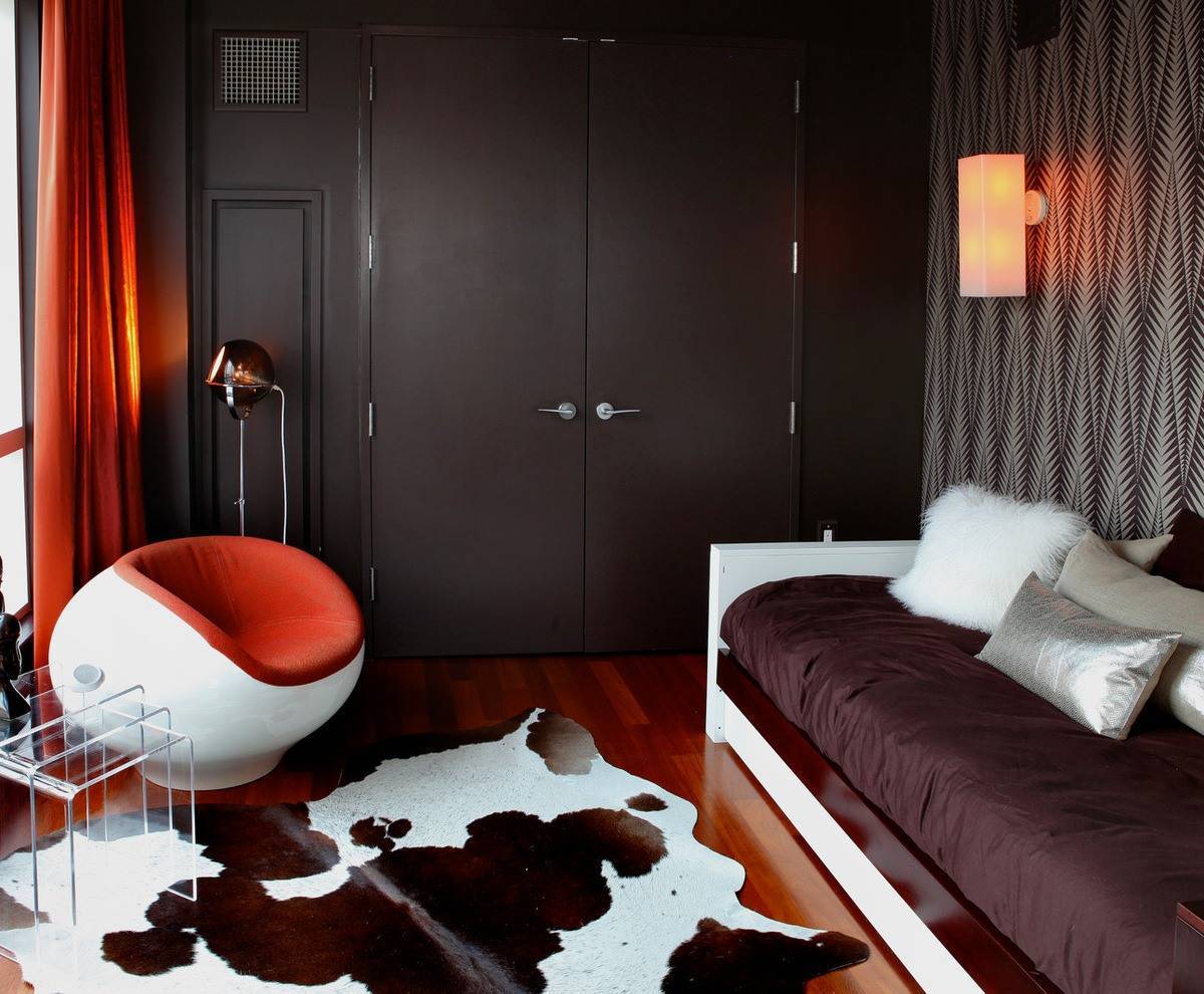 Главным акцентом, безусловно, станет кровать с мягким кожаным изголовьем, имеющим рельеф в форме квадратов или ромбов. Она послужит показателем благосостояния хозяев. При отделке стен и пола дизайнеры рекомендуют использовать натуральные материалы, а также лак, придающий блеск предметам.