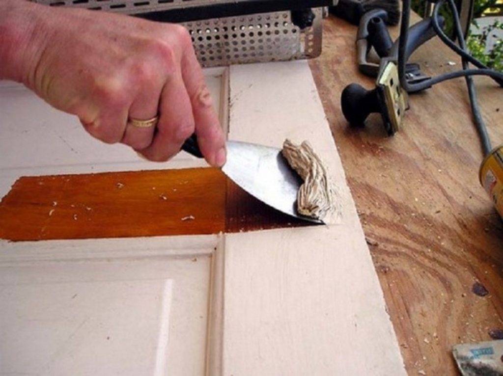 Перед тем, как починить деревянную дверь, следует избавиться от старого покрытия. Проще всего это делать строительным феном и шпателем. Шпателем поддеваем краску, а феном разогреваем ее до такого состояния, чтобы она быстро отстала. Помните, что прибор нагревает поверхности быстро и очень хорошо, поэтому приближайтесь не слишком близко.